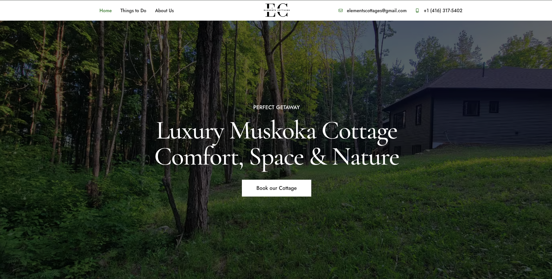 Designed and developed a clean, modern and responsive website for Elements Cottages, a luxury vacation cottage rental in the Muskoka region, Canada. The site highlights the peaceful nature-surrounded retreat, showcases amenities, guest experiences, and booking information with visually engaging layouts that enhance usability and conversion.